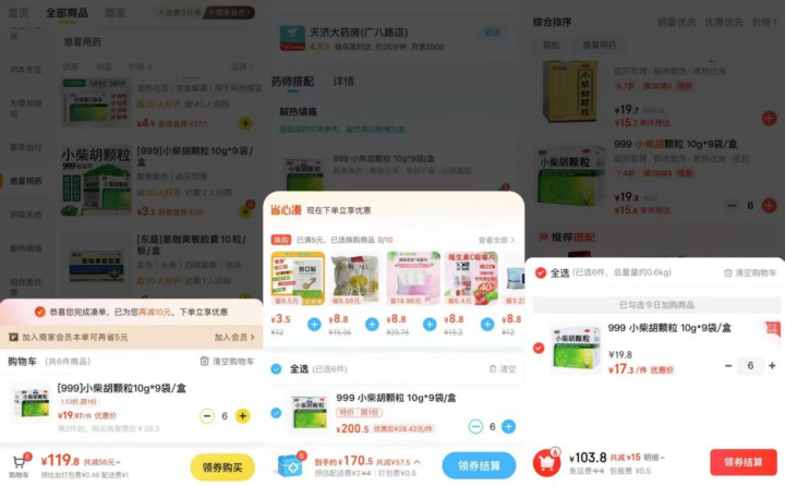 而在补贴力度上,我们选取了同一家天济大药房10g*9袋/盒的999小柴胡感冒灵,在领取了所有平台券后,京东以103.8元的价格略微领先美团的119.8元,淘宝闪购还要170.5元。可见各家在商品和类目上是有抉择的,目前没有绝对的优劣之分。