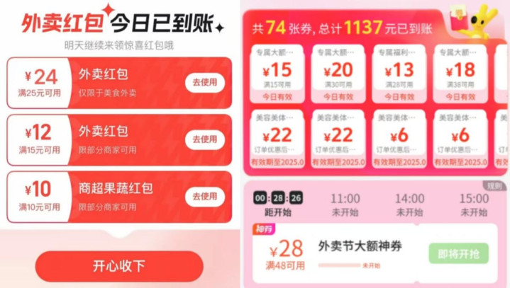 从上周六7月5日开始,美团和淘宝两个平台就像是提前约定好的一样,不约而同地开始“大撒币”。饿了么满25-24元,美团满48-28元、满30-20元是一个接一个送,随便打开一个App,就被醒目的橙色开屏广告晃瞎眼。